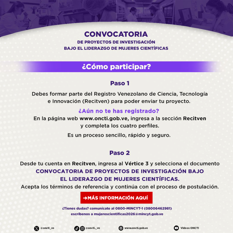 Gracias a tu participación, nuestro Registro Venezolano de Ciencia, Tecnología e Innovación (Recitven) permite identificar las competencias del talento humano capaz de construir soluciones científicas y tecnológicas a problemas complejos y encontrar las respuestas a las necesidades reales y sentidas de la población, actuales y futuras.
